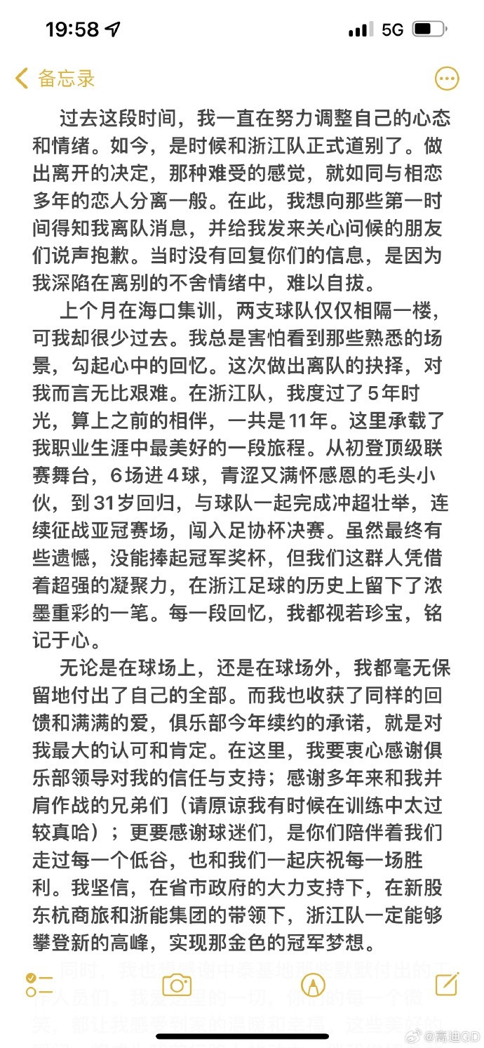 過去這段時間,我一直在努力調(diào)整自己的心態(tài)和情緒。如今,是時候和浙江隊正式道別了。做出離開的決定,那種難受的感覺,就如同與相戀多年的戀人分離一般。在此,我想向那些第一時間得知我離隊消息,并給我發(fā)來關(guān)心問候的朋友們說聲抱歉。當時沒有回復(fù)你們的信息,是因為我深陷在離別的不舍情緒中,難以自拔。