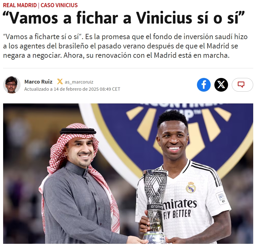 據(jù)悉,沙特方面的報(bào)價(jià)仍未正式發(fā)出,目前唯一擺在臺(tái)面上的就是他們的承諾,沙特人表示他們會(huì)在今夏為維尼修斯向開出一份約3億歐元的巨額報(bào)價(jià),并且堅(jiān)稱“無(wú)論如何我們會(huì)簽下他”(“Le ficharemos sí o sí”)。