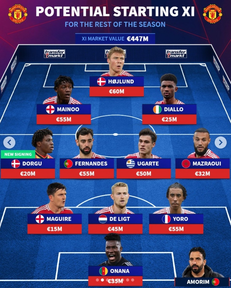 德轉預測曼聯(lián)下半程首發(fā)陣:總身價4.47億歐元