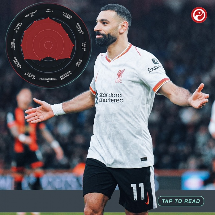 數(shù)據(jù)統(tǒng)計(jì)顯示,這位32歲的埃及邊鋒本賽季英超24場(chǎng)全勤,貢獻(xiàn)22球14助攻,每59分鐘直接參與1球。