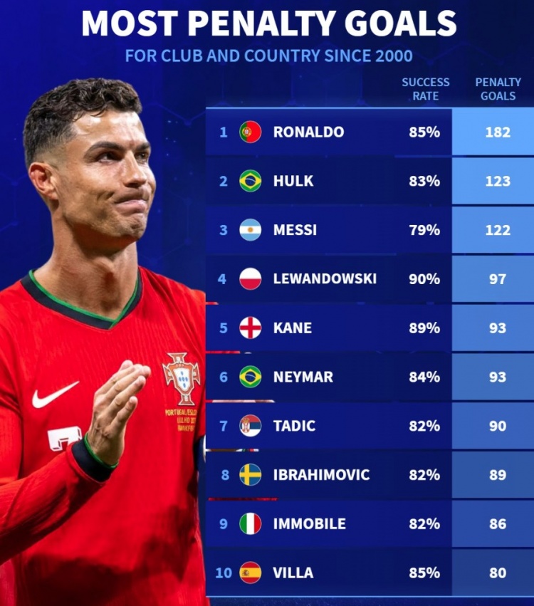 德轉(zhuǎn)新世紀(jì)點(diǎn)球榜:C羅182球、梅西122球,萊萬(wàn)&凱恩&內(nèi)馬爾在列