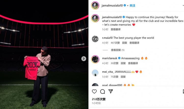 穆西亞拉曬出自己手持印有2030字樣的拜仁球衣照,并表示:“很高興能夠繼續(xù)這段旅程。已經(jīng)準(zhǔn)備好為我們的俱樂(lè)部以及令人難以置信的球迷們竭盡全力了!讓我們共同創(chuàng)造更多美好的記憶吧??”。