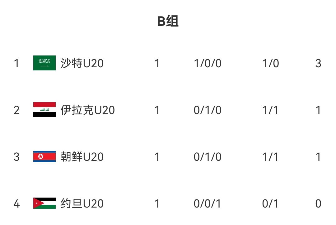 在8強戰(zhàn)中,國足所在的A組前二將與B組前二交叉對陣,目前B組僅進行了一輪比賽,沙特U20暫居第一。