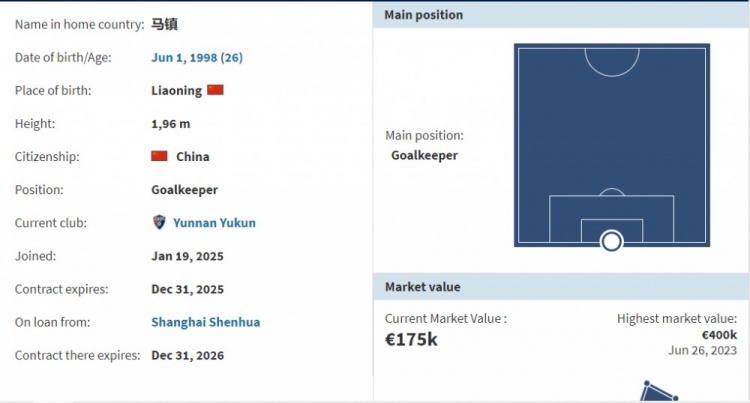 德轉(zhuǎn):云南玉昆租借上海申花門將馬鎮(zhèn)花費(fèi)約200萬人民幣