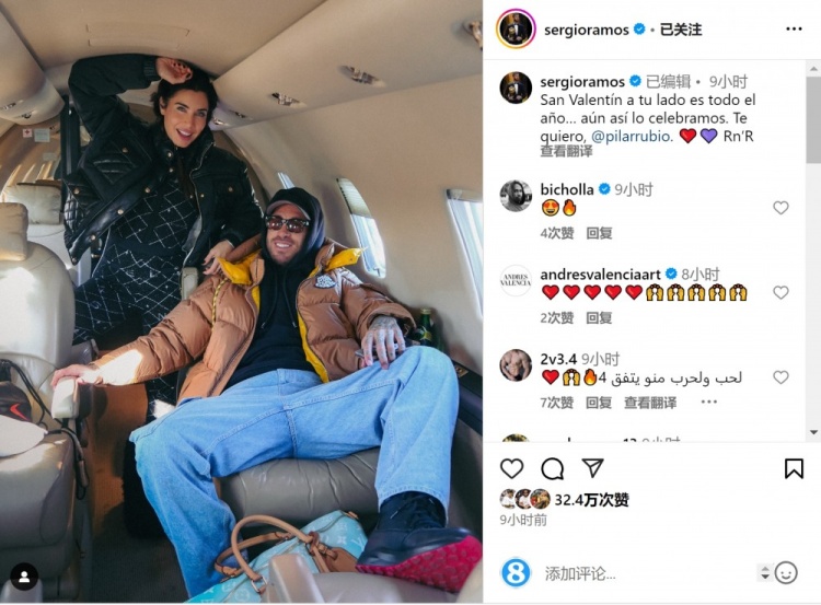拉莫斯社媒曬出與妻子皮拉爾-盧比奧在飛機(jī)內(nèi)的合照,配文:“在你身邊每天都是情人節(jié)……我們?nèi)匀粫?huì)慶祝這個(gè)節(jié)日,我愛(ài)你?!?/p>