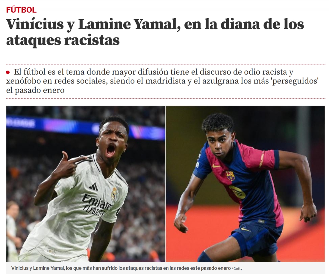 根據(jù)西班牙相關(guān)當(dāng)局最新報告顯示,足球領(lǐng)域已成為西班牙社交媒體上種族主義和仇外仇恨言論滋生最嚴(yán)重、傳播最廣泛的領(lǐng)域?;蜀R球星維尼修斯和巴薩新星亞馬爾成為主要被攻擊目標(biāo),這些充滿攻擊性的言論試圖通過"非人化"受害者來達(dá)到攻擊目的。