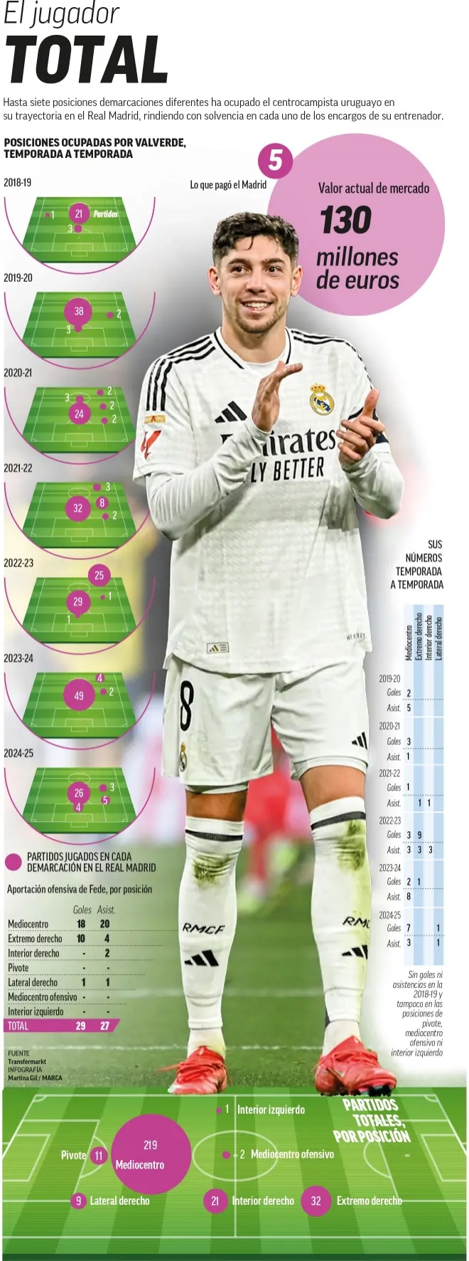 巴爾韋德的主業(yè)則是中場(chǎng),500萬(wàn)歐轉(zhuǎn)會(huì)費(fèi)買(mǎi)下的他,如今身價(jià)1.3億歐。而實(shí)際上,身兼多職的他毫無(wú)疑問(wèn)是無(wú)價(jià)的:邊中場(chǎng),居中,前腰,后腰……師從克羅斯的巴爾韋德,總共擔(dān)任過(guò)7個(gè)不同的位置。