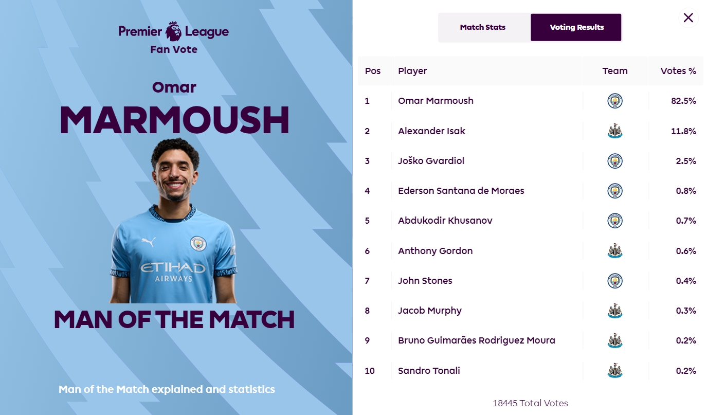 英超官方賽后宣布,馬爾穆什被球迷票選為本場(chǎng)比賽全場(chǎng)最佳,得票率高達(dá)82.5%。