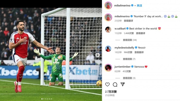 梅里諾首次客串中鋒便打進2球,他也通過社媒曬出自己進球后的慶祝照,并配文:“9號位上班日… ????????”