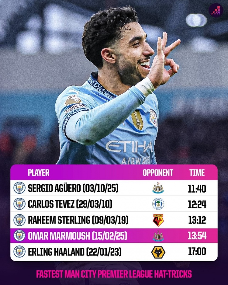 13分54秒!馬爾穆什戴帽間隔是曼城隊(duì)史第4短,阿圭羅第1