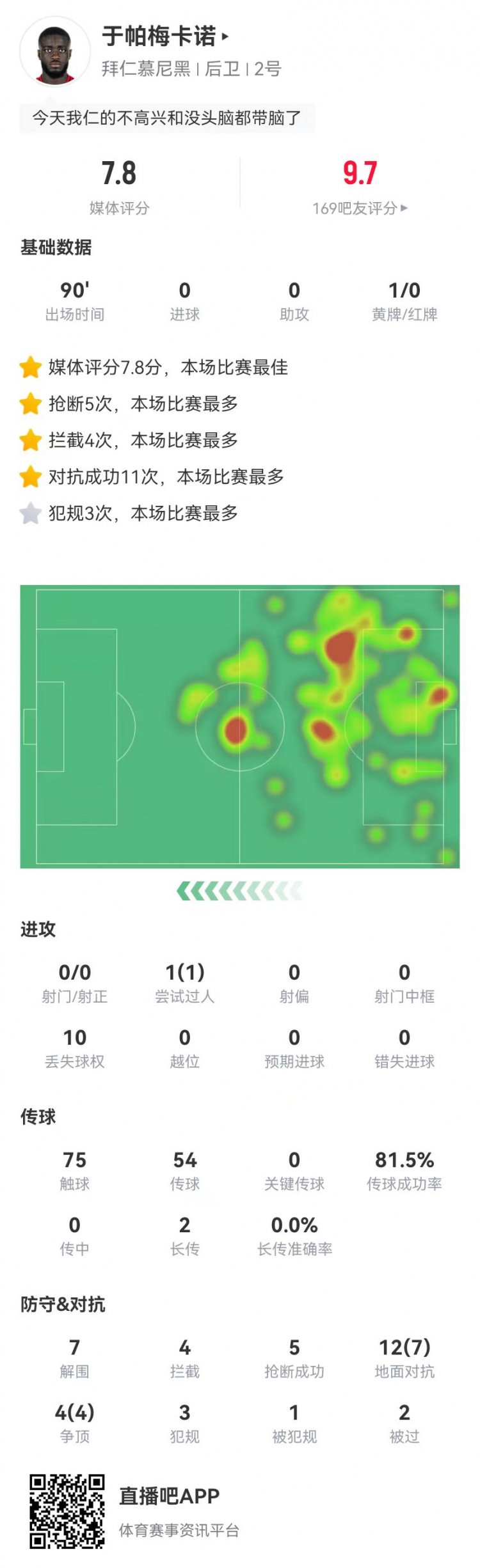 這場(chǎng)不背鍋!于帕本場(chǎng)7解圍4攔截5搶斷1封堵 7.8分并列全場(chǎng)最高