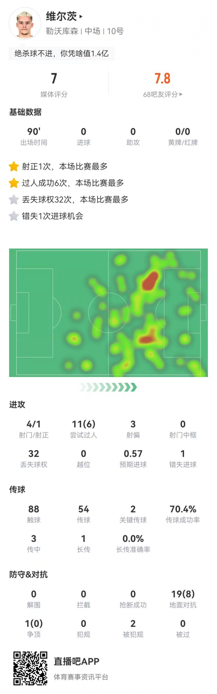 維爾茨本場4射1正+1失良機(jī) 20對抗8成功+2造犯規(guī)+32丟失球權(quán)
