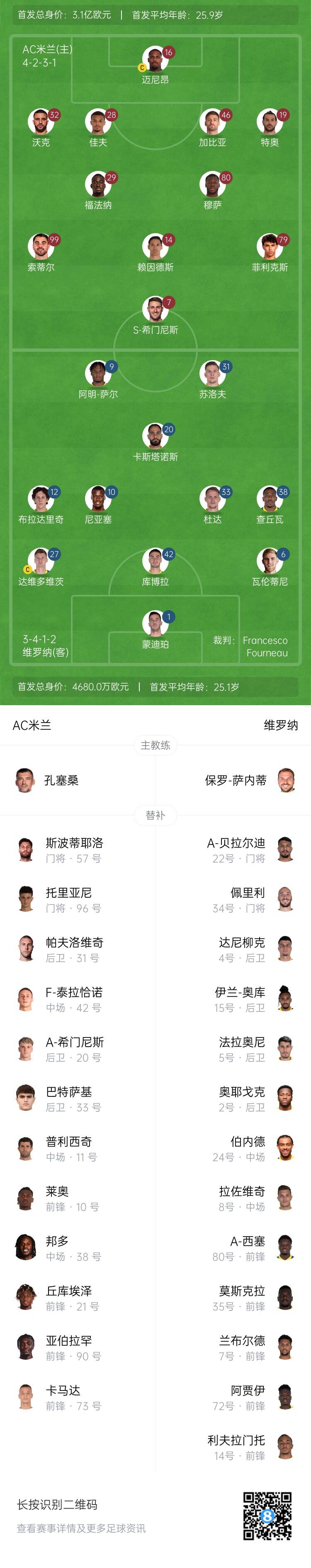 2月16日訊 意甲第25輪,AC米蘭主場對陣維羅納。賽前,官方公布了本場的首發(fā)名單。