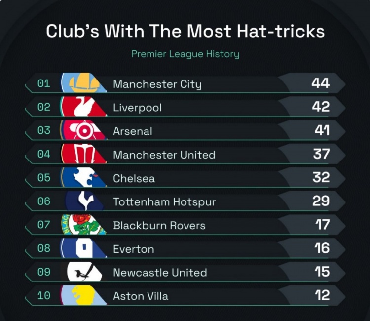 Squawka統(tǒng)計了英超歷史各隊球員戴帽的次數(shù),并列出榜單,曼城44次居首,利物浦42次第二。