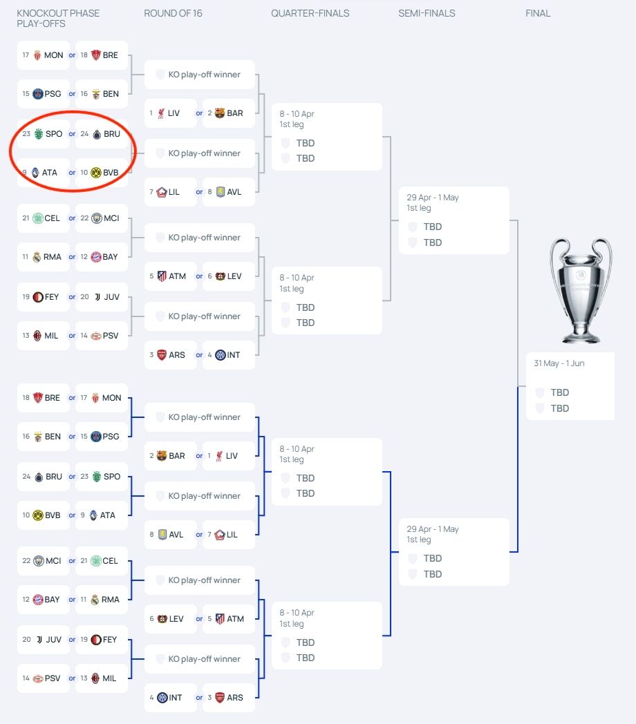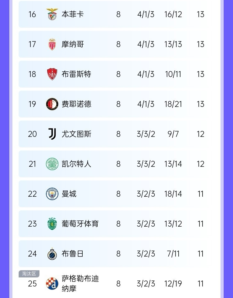 葡萄牙體育本賽季歐冠開局3勝1平,一度高局積分榜第2位,僅次于利物浦。但是前主帥阿莫林被曼聯(lián)挖走之后,球隊(duì)在歐冠3連敗排名瘋狂下滑。最終后4輪驚險(xiǎn)拿下1分的葡體,僅排名附加區(qū)倒數(shù)第2,他們將在附加賽對(duì)陣亞特蘭大或是多特蒙德。