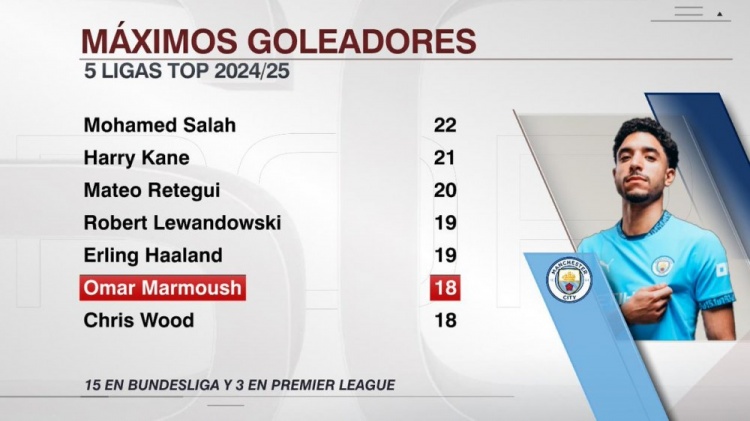 據(jù)ESPN統(tǒng)計,馬爾穆什本賽季在聯(lián)賽中打進18球,并列排名本賽季五大聯(lián)賽射手榜第6位。