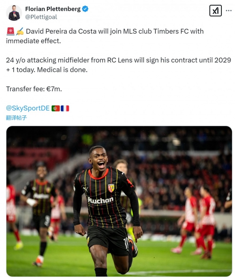 記者:朗斯中場(chǎng)科斯塔將加盟美職聯(lián)波特蘭伐木工,轉(zhuǎn)會(huì)費(fèi)700萬歐