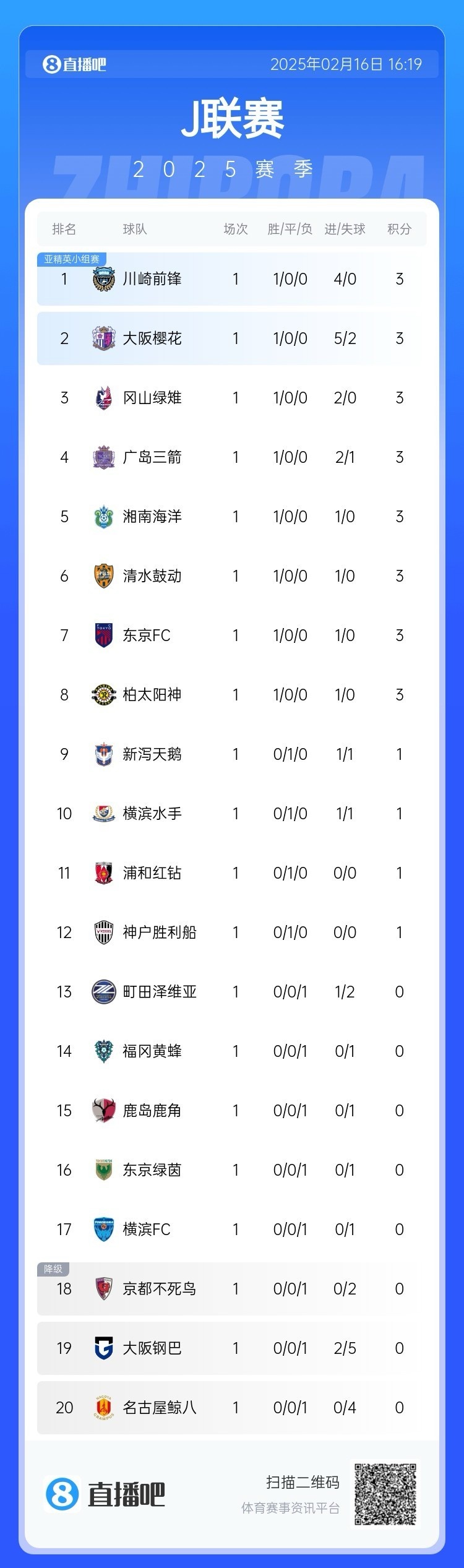 新賽季J1首輪情況:大阪櫻花5-2大阪鋼巴,川崎前鋒4-0名古屋鯨八