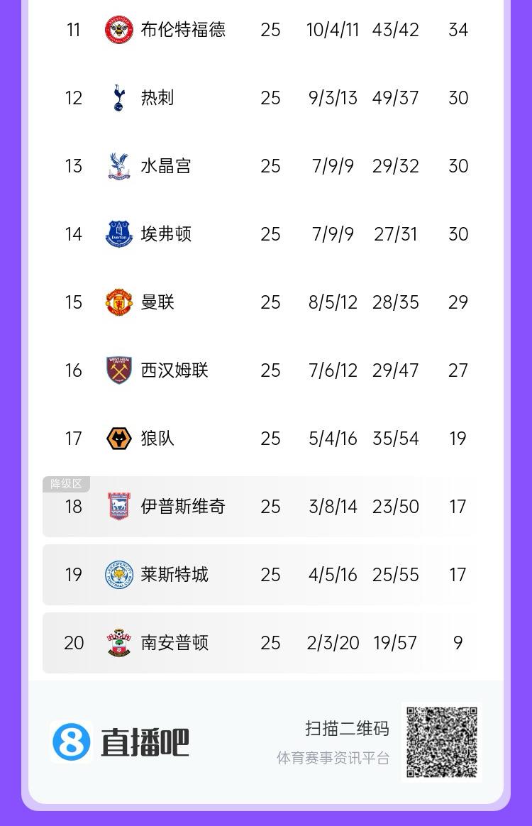 聯(lián)賽前25場(chǎng),曼聯(lián)8勝5平12負(fù),打進(jìn)28球丟了35球,凈勝球已低至-7球。上賽季,曼聯(lián)最終在英超打進(jìn)57球丟58球,以-1凈勝球收官。