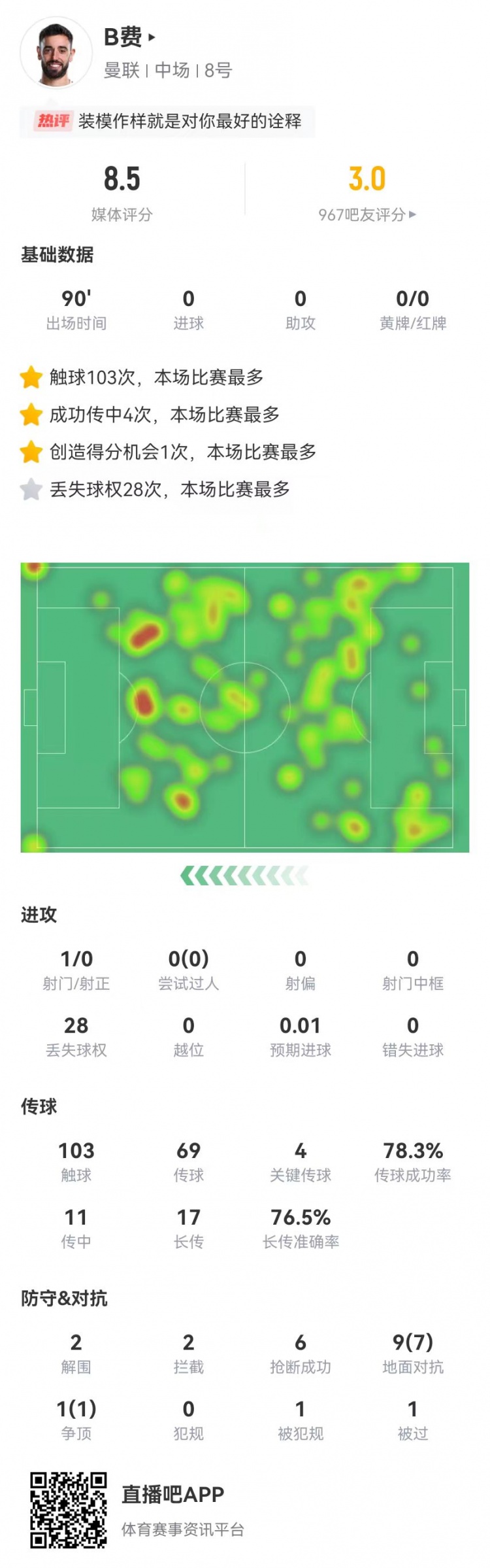 B費本場4關(guān)鍵傳球+10對抗8成功 28丟失球權(quán)+6搶斷 8.5分全隊最高