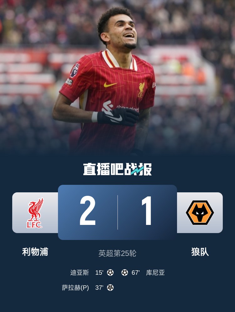 英超第25輪,利物浦2-1戰(zhàn)勝狼隊(duì),迪亞斯破門(mén)、薩拉赫點(diǎn)射。