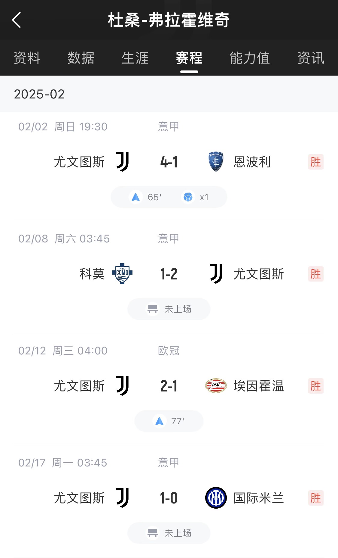 2月份至今尤文的4場比賽,弗拉霍維奇2場未登場,2場替補,打入1球。