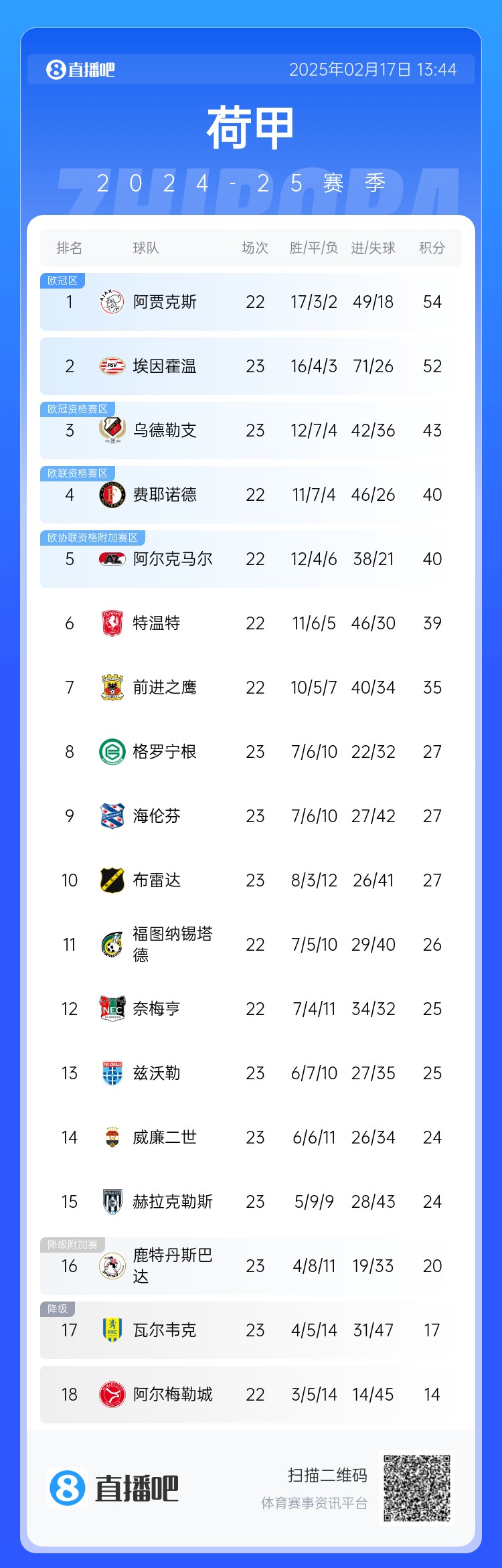 此外,周中這兩家爭(zhēng)冠的荷甲豪門還都有歐戰(zhàn)任務(wù),不過(guò)阿賈克斯首回合2-0勝圣吉羅斯,埃因霍溫則比較艱難,他們首回合1-2不敵尤文圖斯。