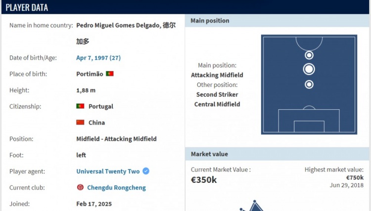 德爾加多現(xiàn)年27歲,司職中場,此前共為山東泰山隊在各項賽事出場59次,打進16球,貢獻5次助攻。