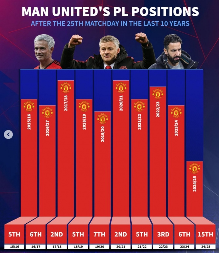 近10年曼聯(lián)英超25輪后排名:此前九年最差第7,本賽季第15