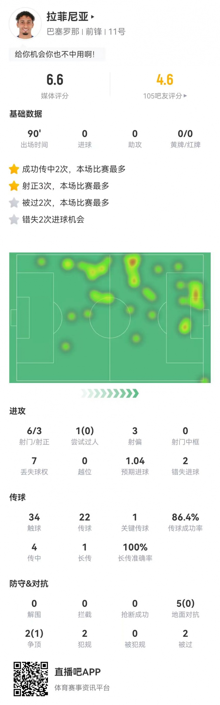 低迷!拉菲尼亞本場6射3正2失良機 1關(guān)鍵傳球+7對抗1成功 獲6.6分