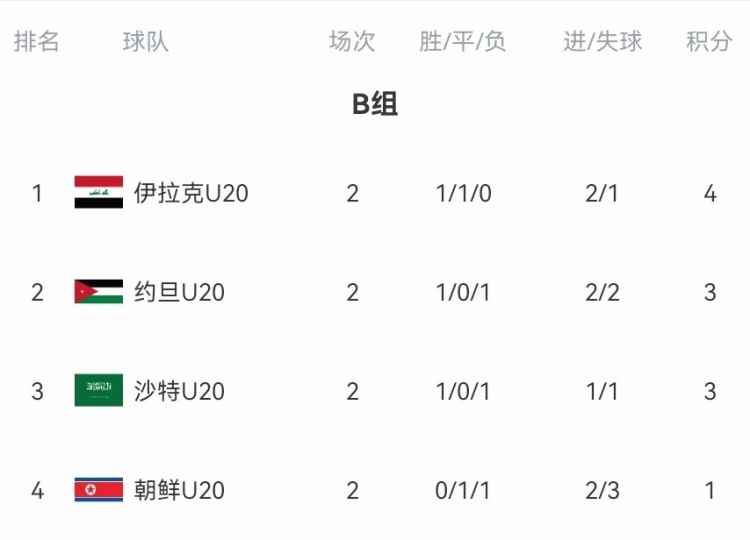 不過B組當前形勢較為復(fù)雜,沙特U20將在末輪對陣朝鮮U20、伊拉克U20則將和約旦U20對話。4支球隊均存在晉級可能和出局可能。除了朝鮮U20之外,其他3隊都可能成為小組頭名。由于B組末輪比賽將在明日才會開戰(zhàn),也無從參考。