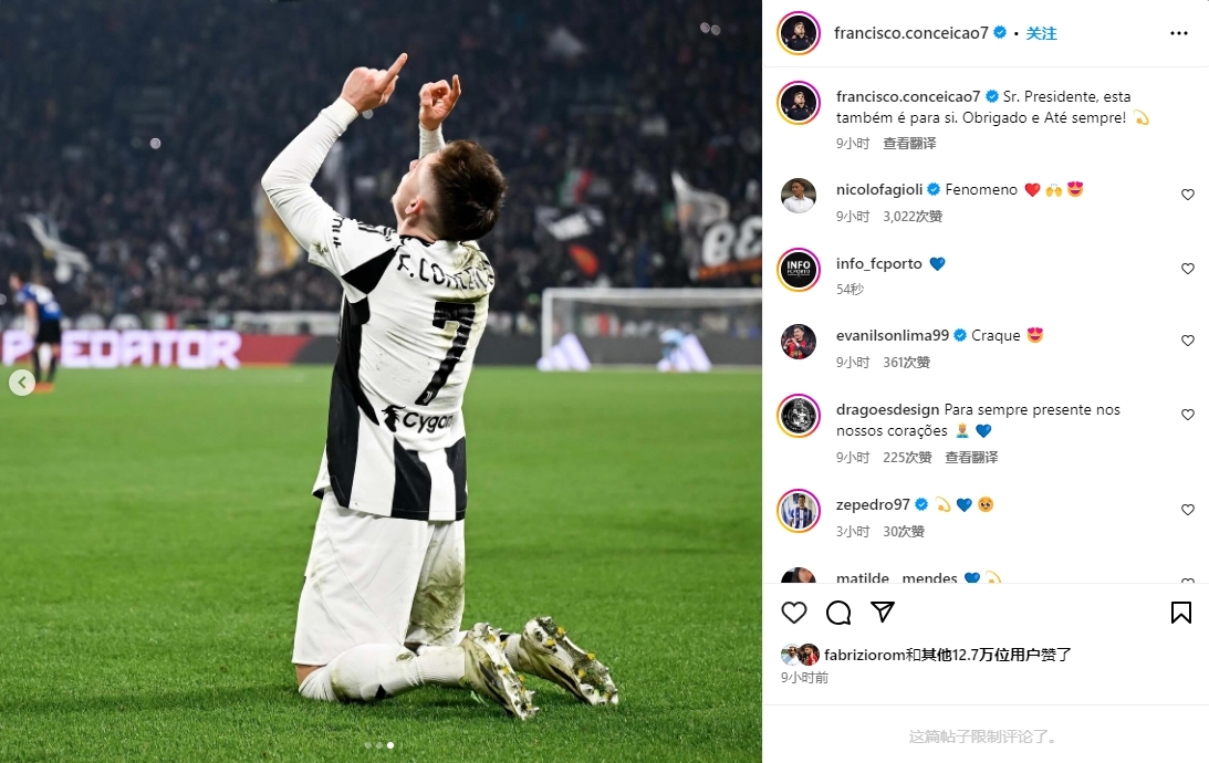 在第25輪意甲聯(lián)賽,尤文主場(chǎng)1-0戰(zhàn)勝國(guó)米,小孔塞桑打進(jìn)制勝球。他在進(jìn)球后先是沖到場(chǎng)邊和隊(duì)友們一起慶祝,隨后還雙膝跪地并舉起雙手食指指向天空。賽后小孔塞桑在Instagram上表示:“主席先生,這是獻(xiàn)給你的。我會(huì)永遠(yuǎn)感謝你!”