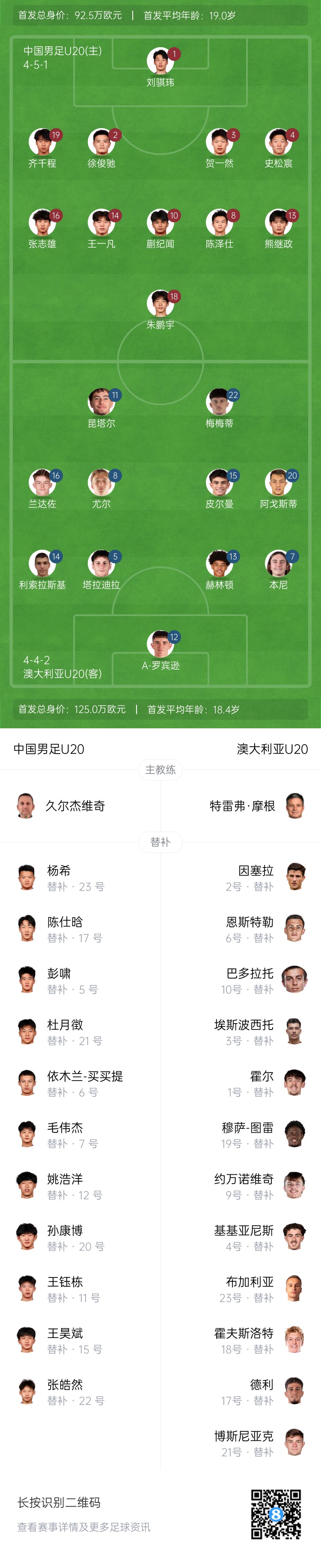 U20亞洲杯-中國vs澳大利亞:雙方均輪換!朱鵬宇先發(fā),依木蘭替補