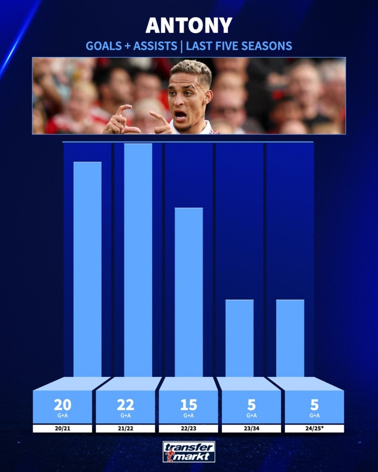 安東尼近5個賽季參與進球數(shù)量(所有俱樂部賽事):