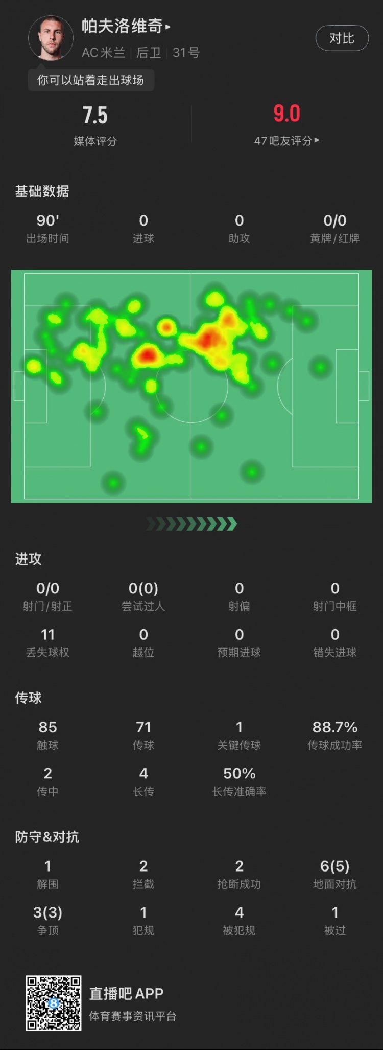 盡力局!帕夫洛維奇本場:9次對抗成功8次,貢獻(xiàn)1解圍2攔截2搶斷