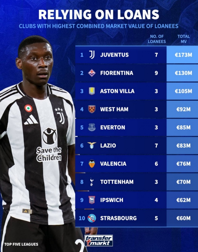 租借球員總身價榜:尤文1.73億歐居首,維拉1.05億歐第3,熱刺第8