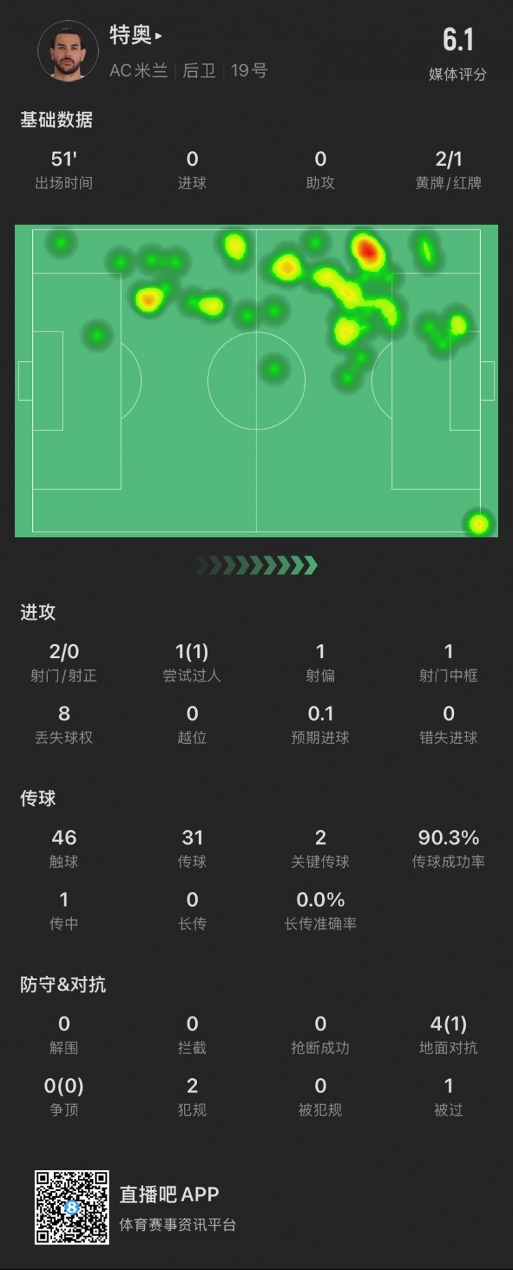 特奧本場:2黃變1紅離場,2腳關(guān)鍵傳球,4次對抗成功1次,被過1次