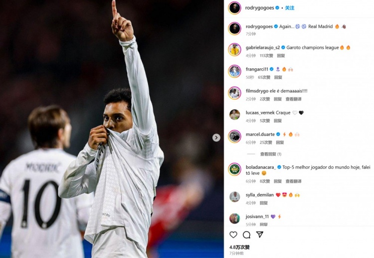 羅德里戈也在賽后通過(guò)社媒曬出自己的慶祝照,并配文:“又一次……???? 皇家馬德里????????????”。