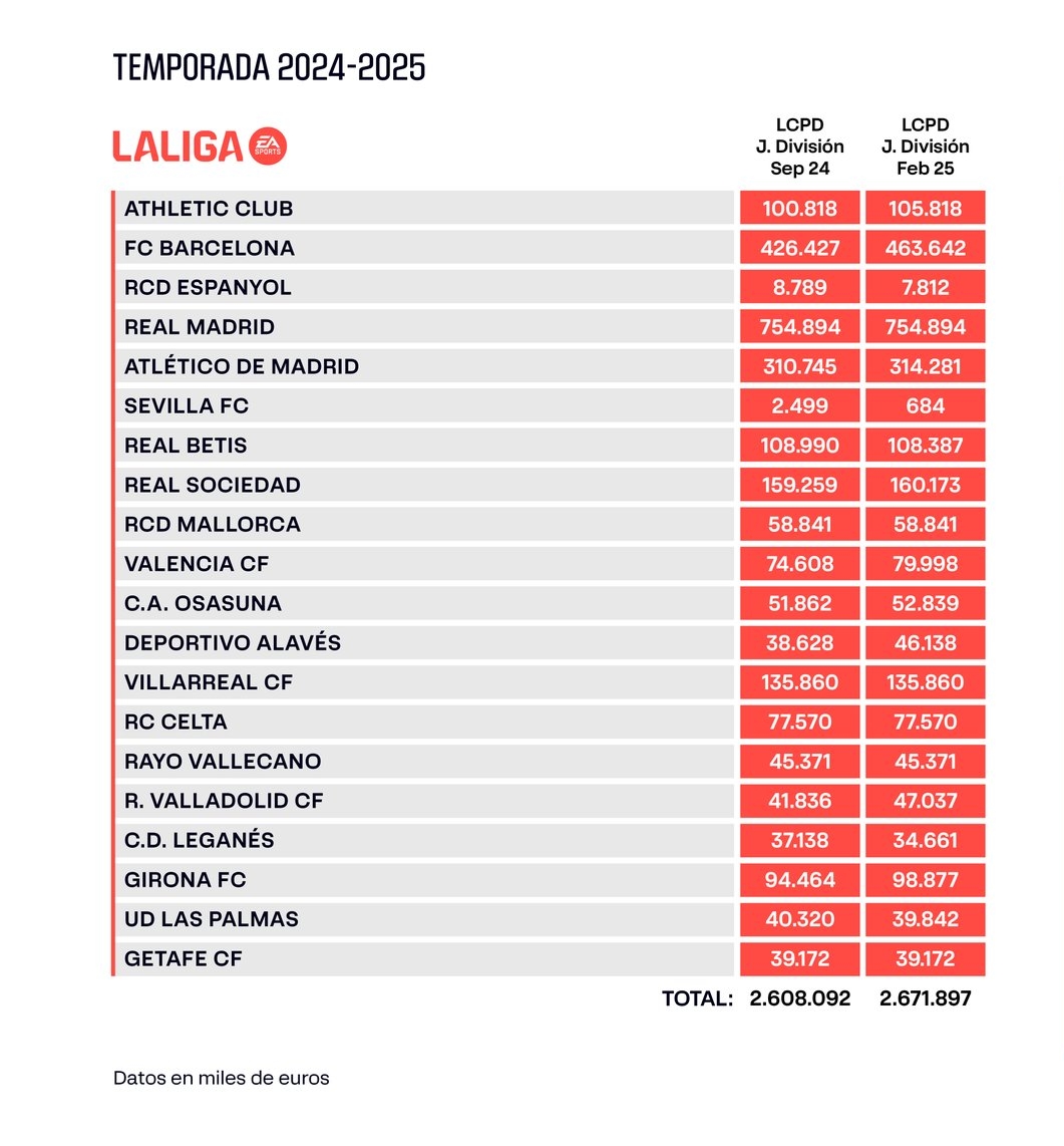 西甲官方在冬窗后更新了更新的各隊(duì)工資帽,皇馬7.55億歐居首,巴薩4.64億歐第二。