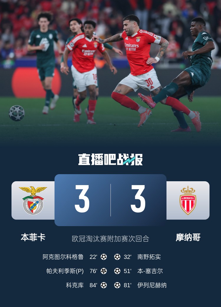 本菲卡3-3總比分4-3淘汰摩納哥晉級(jí)16強(qiáng)。