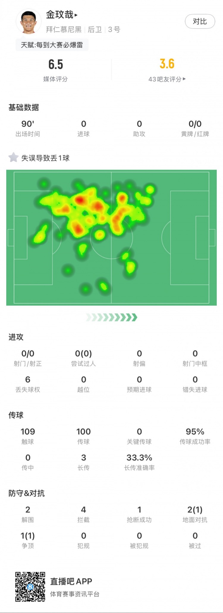 金玟哉全場(chǎng)數(shù)據(jù):1次失誤致丟球,4次攔截,2次解圍