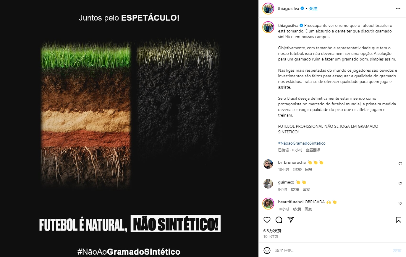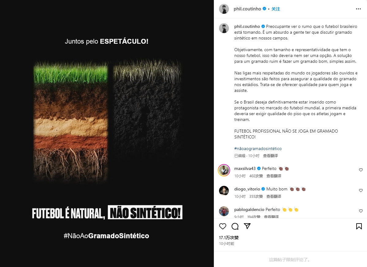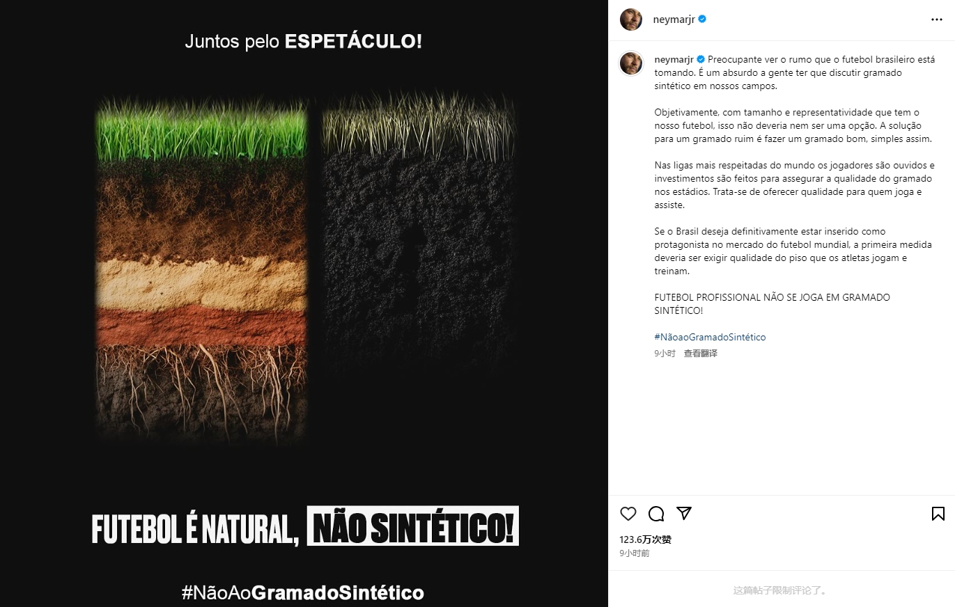 02月19日訊 內(nèi)馬爾、庫(kù)蒂尼奧、蒂亞戈-席爾瓦等人社媒發(fā)布相同的長(zhǎng)文,對(duì)巴西足球球場(chǎng)使用人工草皮進(jìn)行批評(píng)。