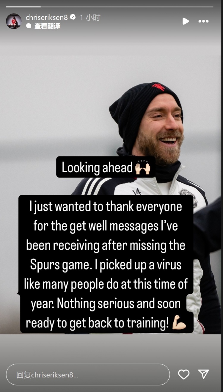 埃里克森寫道:“展望未來(lái)。我只是想感謝大家在我缺席對(duì)陣熱刺比賽后發(fā)來(lái)的祝福信息,我就像每年這個(gè)時(shí)候的很多人一樣感染了(流感)病毒,沒(méi)什么大礙,很快就可以恢復(fù)訓(xùn)練了!”