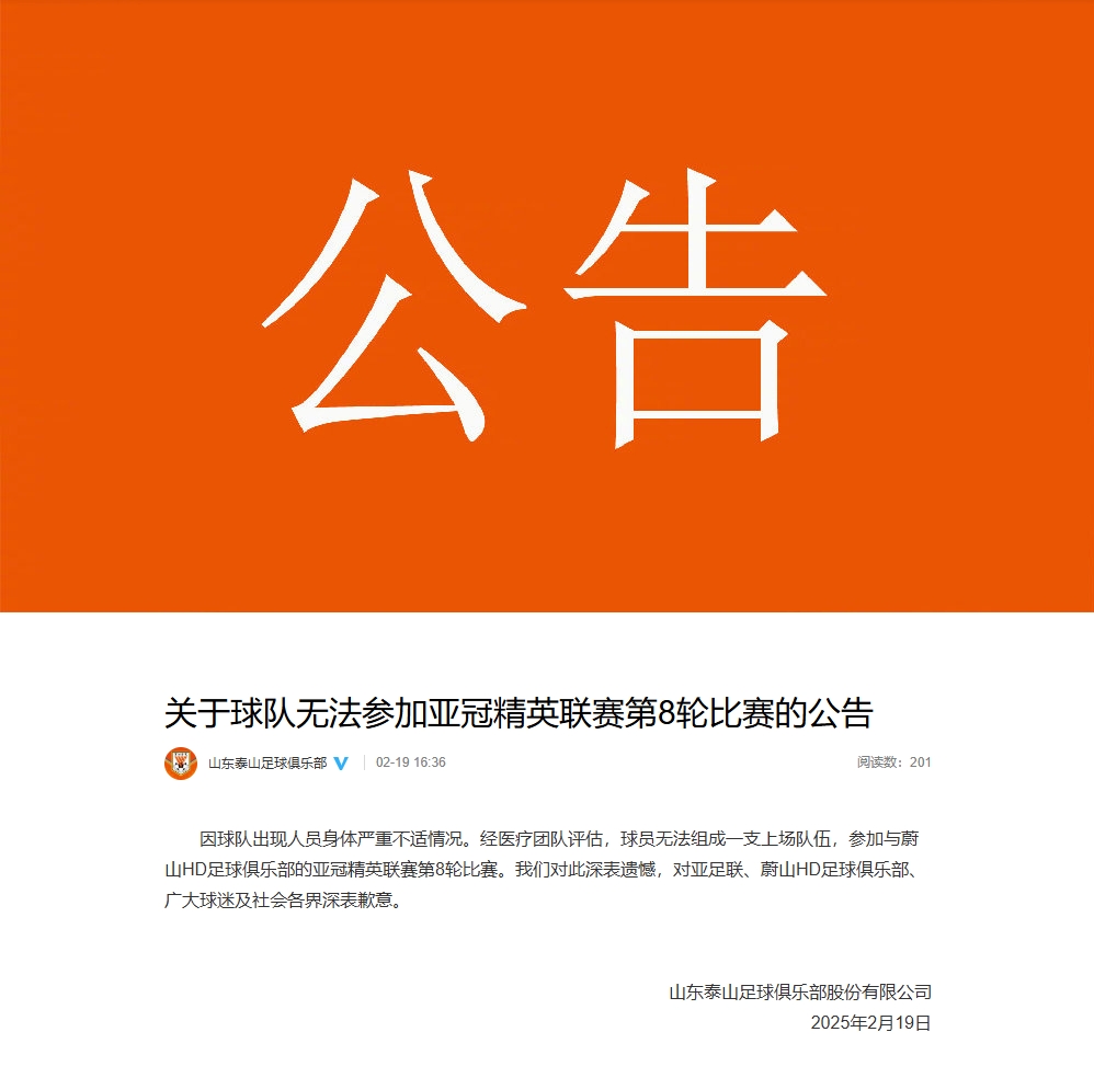 02月19日訊 泰山官方就退賽發(fā)布聲明。