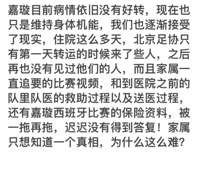 嘉璇目前病情依舊沒有好轉,現(xiàn)在也只是維持身體機能,我們也逐漸接受了現(xiàn)實,住院這么多天,北京足協(xié)只有第一天轉運的時候來了些人,之后再也沒有見過他們的人,而且家屬一直追要的比賽視頻,和到醫(yī)院之前的隊里隊醫(yī)的救助過程以及送醫(yī)過程,還有嘉璇西班牙比賽的保險資料,被一拖再拖,遲遲沒有得到答復!家屬只想知道一個真相,為什么這么難?