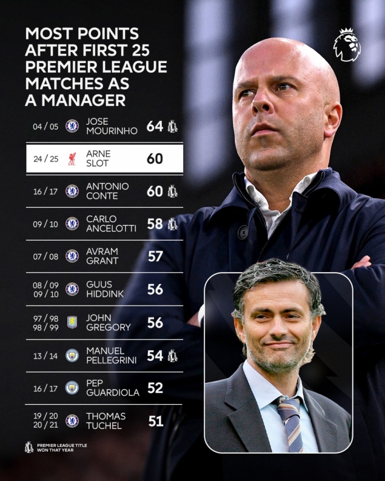 執(zhí)教英超前25場(chǎng)積分:穆帥64分最多,斯洛特60分次席&瓜帥52分