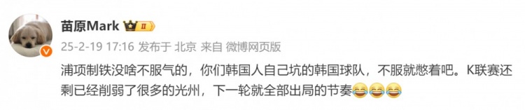 媒體人苗原發(fā)文表示:浦項(xiàng)鐵人沒(méi)啥不服氣的,你們韓國(guó)人自己坑的韓國(guó)球隊(duì),不服就憋著吧。K聯(lián)賽還剩已經(jīng)削弱了很多的光州,下一輪就全部出局的節(jié)奏。