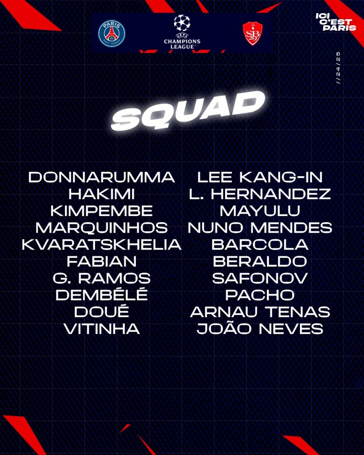 巴黎歐冠對陣布雷斯特大名單