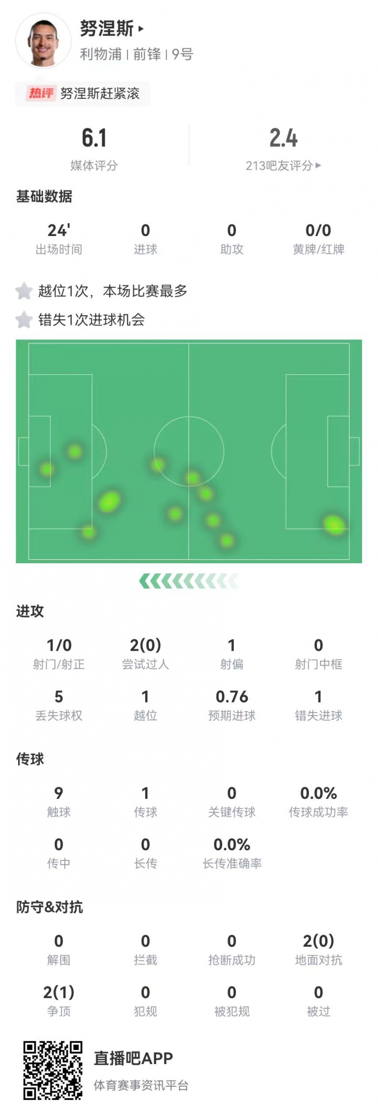 努涅斯本場(chǎng)替補(bǔ)1射門1失良機(jī),4對(duì)抗1成功 獲評(píng)6.1分全隊(duì)最低