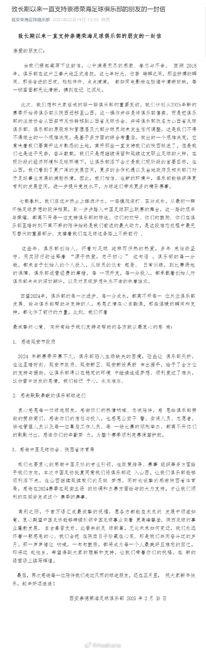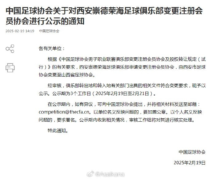 中國足協(xié)公示西安崇德榮海足球俱樂部從西安市足協(xié)變更注冊地到山西省足協(xié)。俱樂部公眾號發(fā)出的文章稱球隊將改名為山西省足球俱樂部。繼上賽季2家俱樂部后,這是《中國足球協(xié)會男子職業(yè)聯(lián)賽俱樂部變更注冊會員協(xié)會及股權(quán)轉(zhuǎn)讓規(guī)定(試行)》施行來第8家進行異地轉(zhuǎn)移的男足職業(yè)俱樂部: